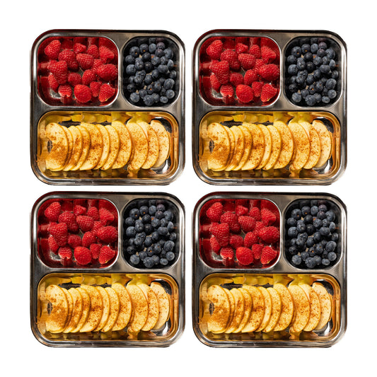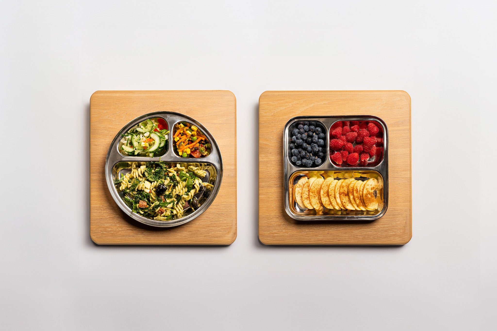 Unsere Kinderteller bestehen aus 100 % Edelstahl und verfügen über drei Fächer, sodass Sie Speisen separat servieren können. Die Kinderteller mit Fächern sind sowohl in runder als auch in eckiger Form erhältlich und stapelbar, wodurch sie leicht zu verstauen sind. Da die Kinderteller aus Edelstahl gefertigt sind, sind sie frei von Schadstoffen wie Kunststoff und BPA, sodass Ihr Kind bedenkenlos davon essen kann. Sie sind außerdem besser für die Umwelt.