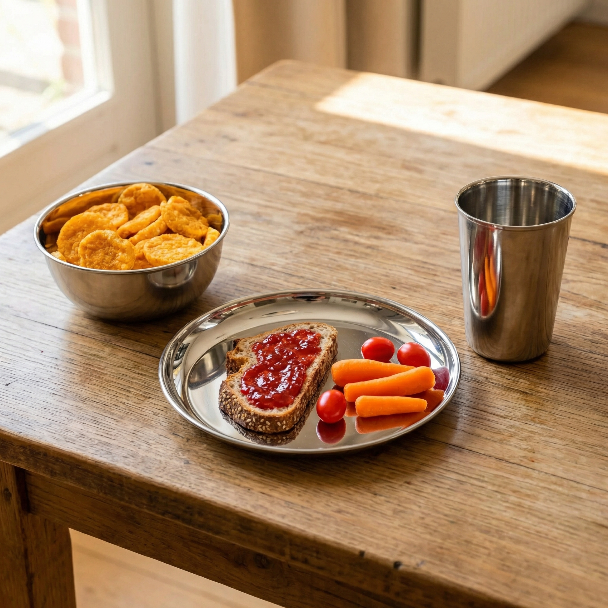 4 Edelstahlteller | ø 24,5 cm, Höhe 1,5 cm 4 Edelstahlbecher | ø 7,5 cm, Höhe 11 cm, Fassungsvermögen 350 ml 4 Edelstahlschüsseln ø 15 cm, Höhe 6 cm